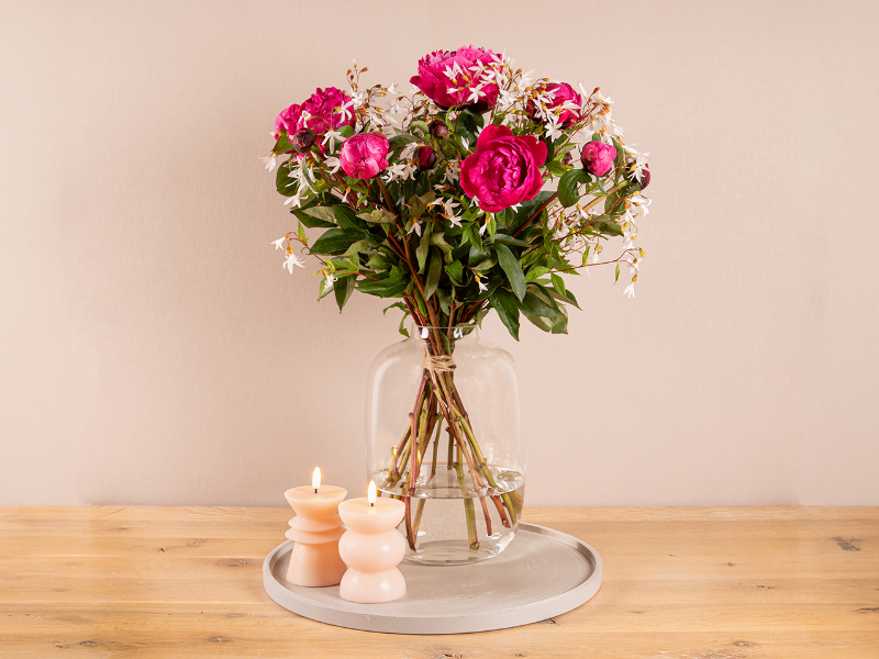 De kleuren van de pioenrozen kunnen afwijken in verband met de beschikbaarheid. Getoonde afbeelding komt overeen met formaat 'Normaal'.